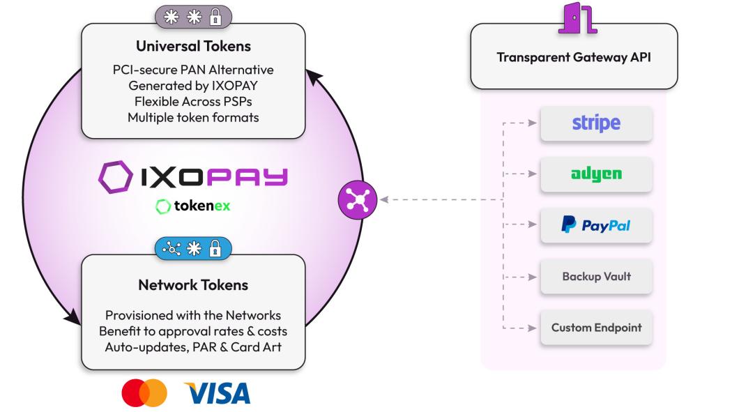 Within the IXOPAY, Universal Tokens are stored alongside provisioned Network Tokens. Having access to multiple token types adds redundancy and stability to your payment infrastructure, while the Transparent Gateway provides a secure connection to any endpoint your business needs.