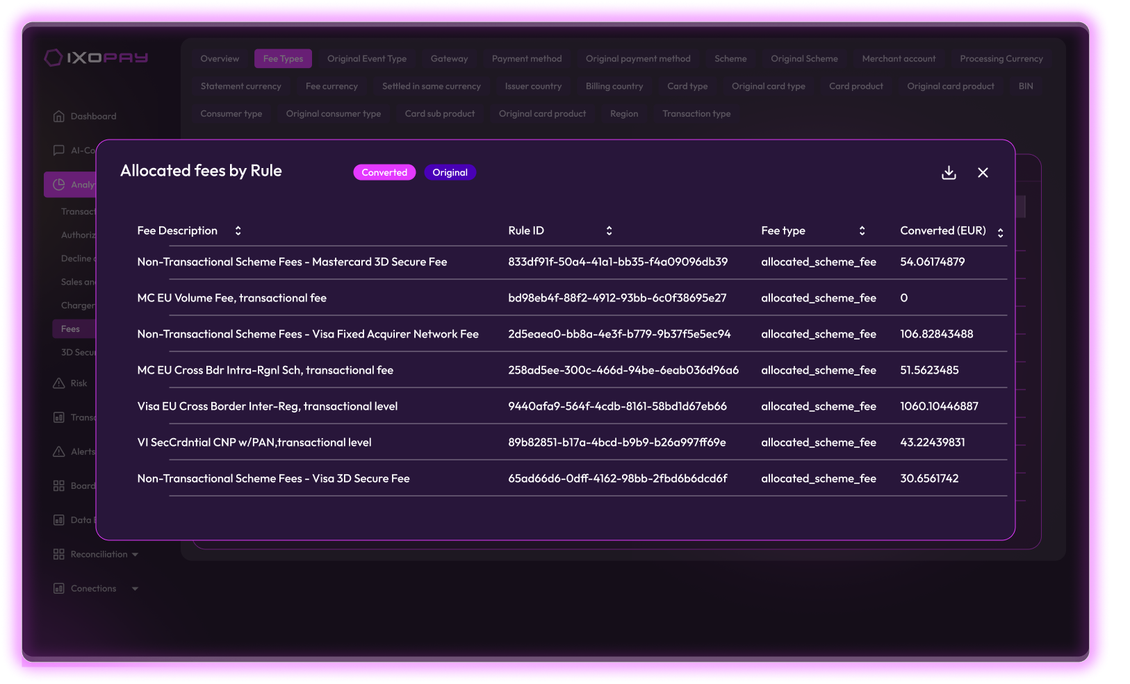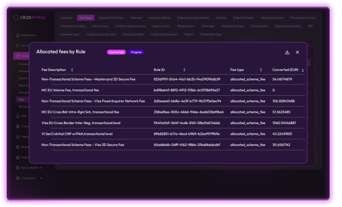 Our engine assigns fees down to the singular transaction level, eliminating the ambiguity of bulk summary totals. By drilling into specific interchange and scheme fees, you can monitor all PSP invoice items to reconcile expectations against actuals. This level of granularity allows you to calculate the "Effective Cost"—an all-in rate that combines base charges, FX conversion fees, and non-transactional penalties—ensuring you avoid overcharges and protect your margins.